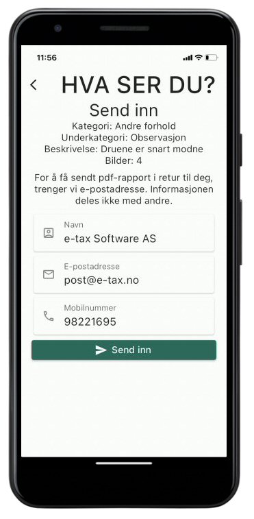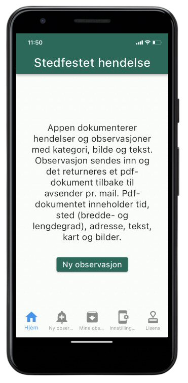Appen er et verktøy for å dokumentere hendelser og observasjoner med kategori, bilder og tekst. Observasjonen sendes inn og det returneres et pdf-dokument tilbake til avsender pr mail. Dokumentet inneholder tid, sted (gps-koordinater), adresse, gbr, bnr, tekst, kart og bilder.